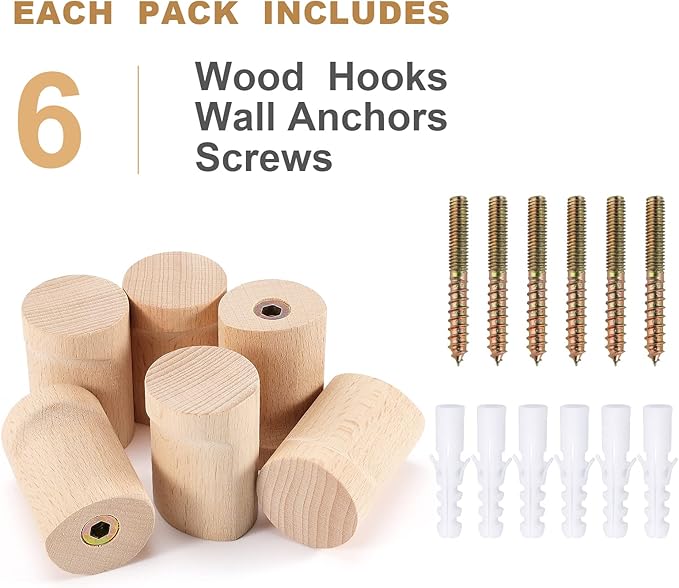 Wood Wall Hooks 6 Pack, Natural Wooden Coat Hooks Wall Mounted, Handmade Rustic Hat Hooks Heavy Duty Entryway Wall Hangers for Hanging Towels, Clothes, Bags (Beech Wood)