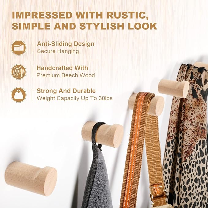 - BEAUTIFULLY HANDCRAFTED: Our rustic wall mounted coat hooks are handcrafted from 100% beech wood with attention to detail and design. Finely polished to a smooth, splinter-free surface while retaining the beautiful natural wood grain, add rustic beauty to your home.
