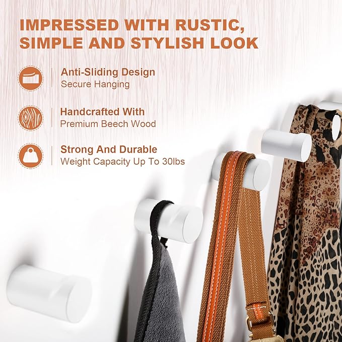 - SIMPLE BUT CAPABLE: Thick solid wood construction with built-in mounting metal hardware, these heavy duty wall hooks are capable to easily hold up to 30 lbs of weight each, and anti-sliding design ensures things are secure hold to avoid slidding off.