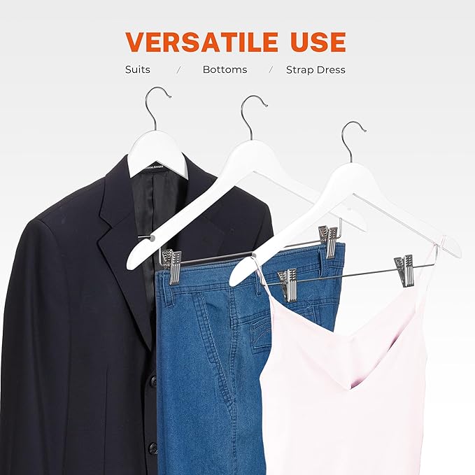 - Multifunctional & Space Saving Hangers - The shoulder line on the wooden hanger is contoured to help preserve clothes shape. There are grooves on each shoulder be used to hang your tank tops, dress, bars, ties, belts, nightgowns,shawls, skirts overalls tightly without slip. What's even more surprising is that we have additionally added two removable metal clips to hang pants of various sizes for you, further saving space in the clothset.