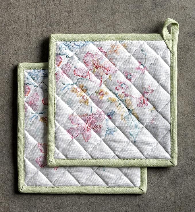 • Package includes: 2 pot holders measures 8"x8". Ideal as a hot pad for dishes, coffee pots, cast iron pans, or cookware. Designed in Europe and Made in India, it blends style, function, and comfort into a daily kitchen essential