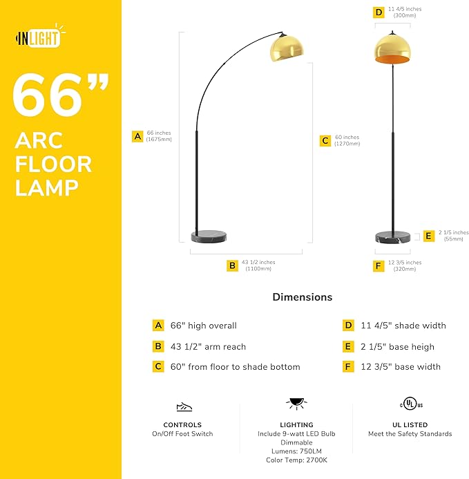 GETINLIGHT Inlight 66" Modern Antique Brass Arc Floor Lamp with Inner Gold Metal Shade and Black Marble Base, Bulb Not Included, IN-0806-1-AG