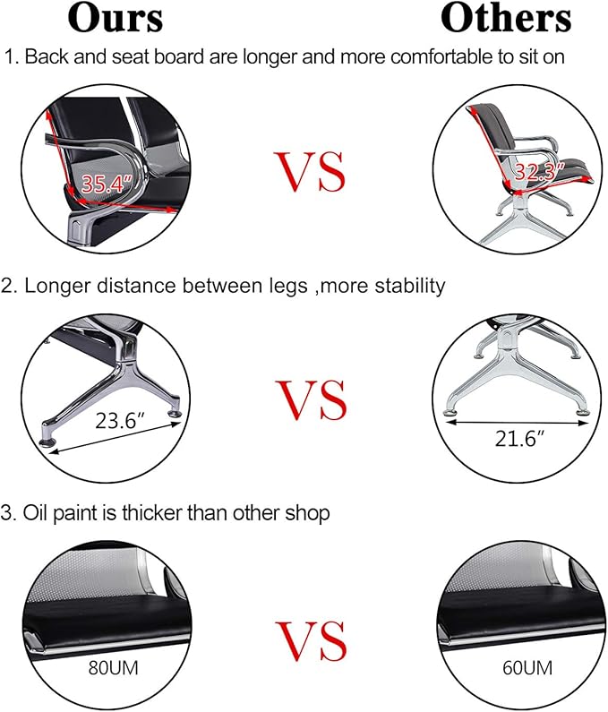 - 【Stable & Durable】Constructed with Stainless Steel(1.5mm thickness perforated cold-rolled steel, powder coated, 1.2 mm thickness cold-rolled steel, chromed) and quality PU leather, the waiting chair offers a comfortable seating experience. Prevent to rust and prolong service life. Maximum weight capacity for each chair is 330 lbs.