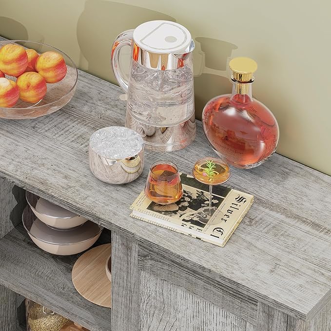 - ⭐【Ample Storage Space】Are you still worried about the messy utensils? Now the buffet cabinet can help you keep your dining area tidy and organized. You can place nice-looking cups on the 2 open shelves, and use inside shelves(3 adjustable height) to store canned and boxed foods, plates, and table cloths. Ideal for bread maker or microwave oven on the spacious tabletop.