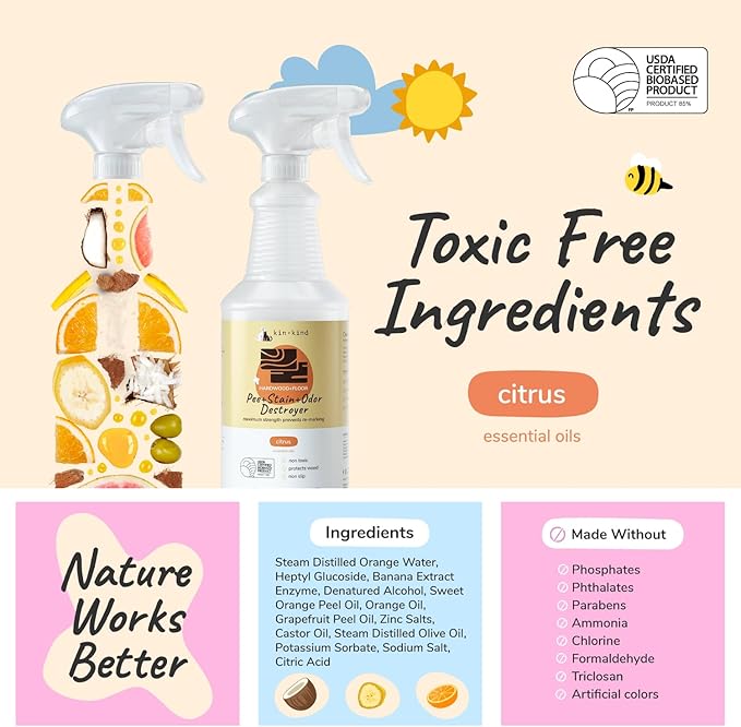 kin+kind Pet Odor Eliminator for Home - Litter Deodorizer, Pet Urine Odor Eliminator Spray and Stain Remover Spray for Harwood Floods, Carpet and Fabric - Pee, Odor and Stain Destroyer 32 fl oz
