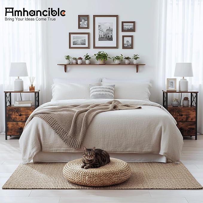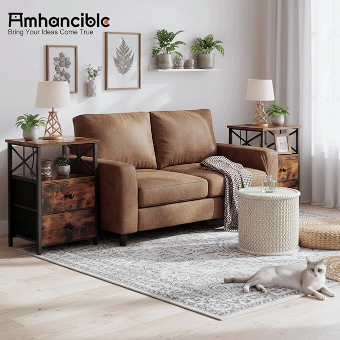 AMHANCIBLE Night Stand Set 2, Nightstand with Charging Station, End Tables Living Room with USB Ports and Outlets, Bedside Tables with Fabric Drawers for Bedroom, Rustic Brown HET05XBR