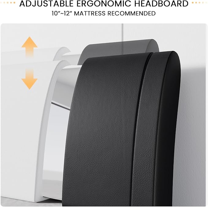 - ERGONOMIC HEADBOARD: The curved backrest can fit your waist better, which provides comfortable support for you to lean on. The headboard can be adjusted to fit different mattress thicknesses. 10-12'' mattress recommended