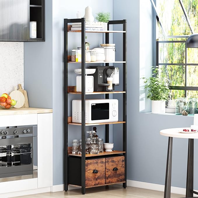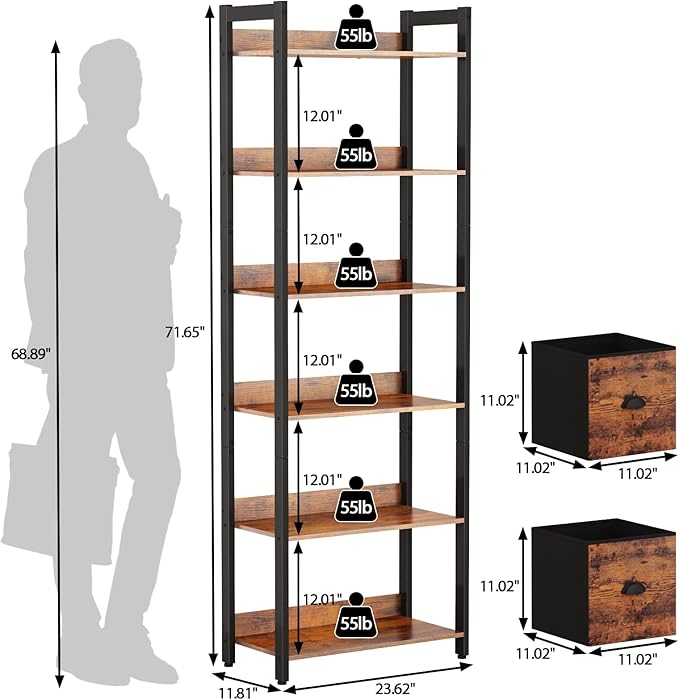 Furologee 6-Tier Bookshelf, Tall 71" Rustic Bookcase with 2 Drawers Storage Organizer, Industrial Display Free Standing Shelf Units, Wood and Metal Storage Rack for Home Office, Bedroom, Rustic Brown