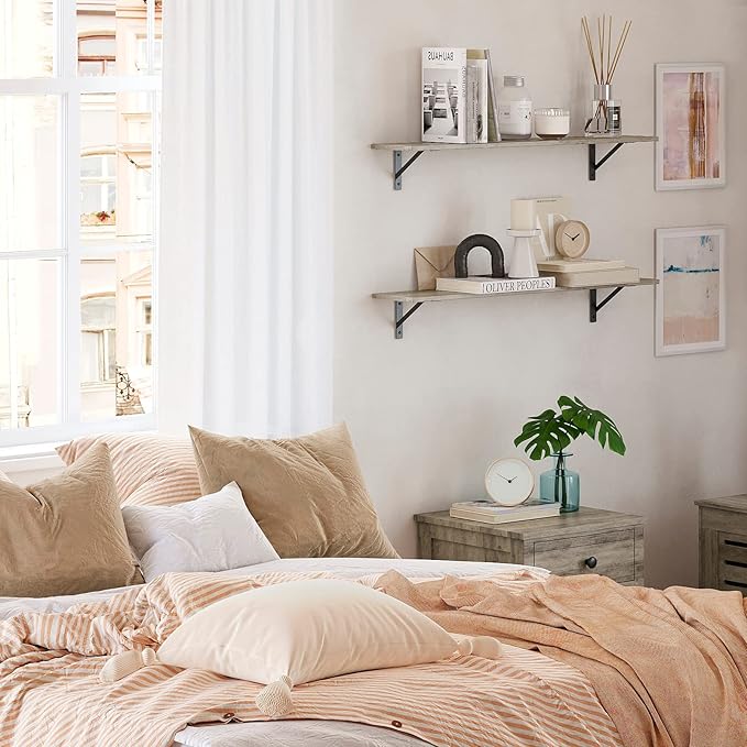 DINZI LVJ Wall Shelves, 23.6 x 7.9 x 6.1 Inch Floating Shelves for Wall, Set of 2, Easy-to-Install Wall Storage Ledges with Sturdy Metal Brackets for Living Room, Bathroom, Kitchen, Gray Wash