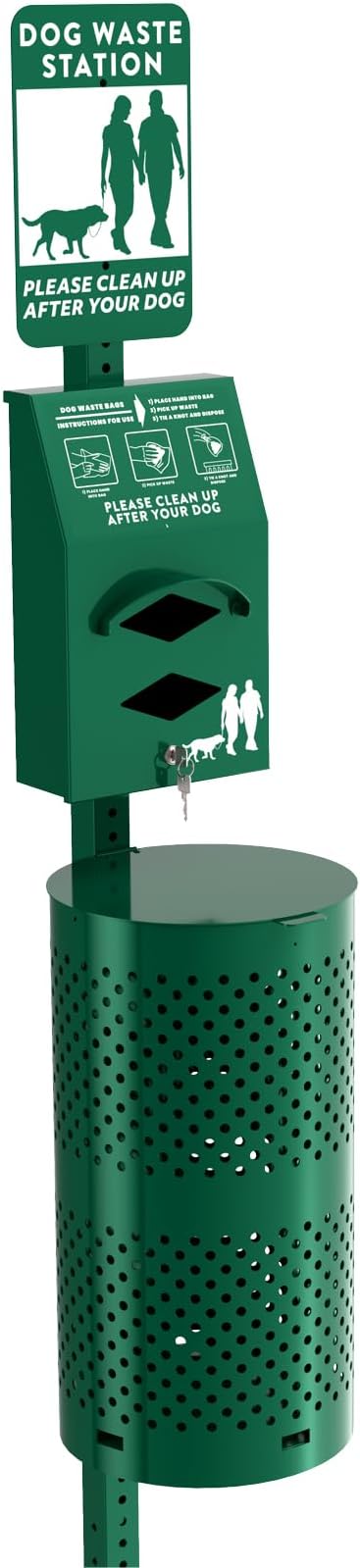 - Hardware Included for Easy Setup: Our pet waste trash can comes with mounting pillars, nuts and bolts, so you can easily install the sign, locking dispenser, and trash can with lid as a dog park equipment (Trash bags and post base not included.)