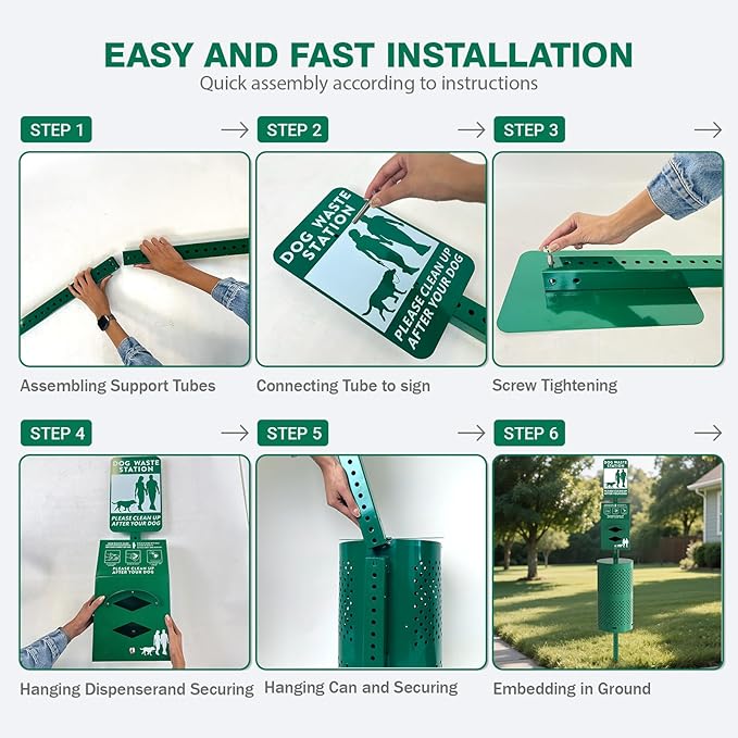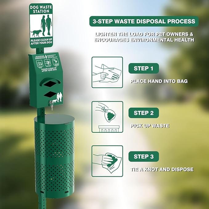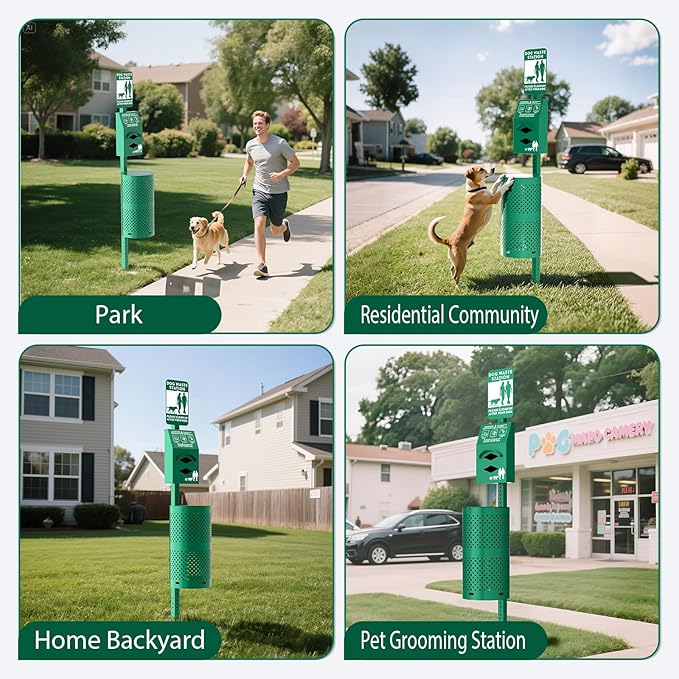 - Commercial and Residential: This dog waste trash bin serves as an outdoor poop bag dispenser in dog parks, a backyard dog poop trash can at home, or a pet waste container in your neighborhood. Our doggie trash can is easy to install, and can works anywhere.