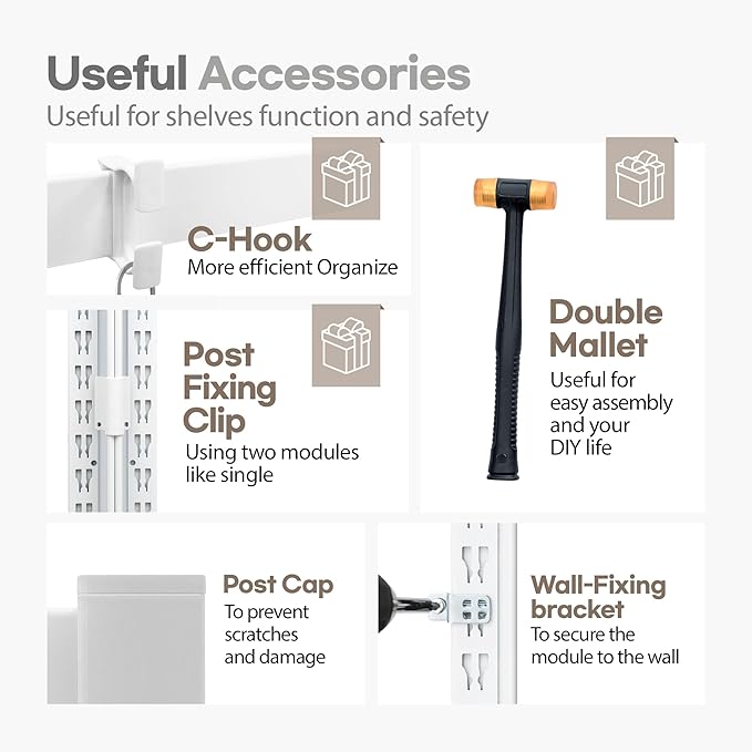 - EASY BOLTLESS ASSEMBLY (MALLET INCLUDED) – No bolts or nuts required. Simply slide and lock parts together using the included Rubber Mallet. Shelves are height-adjustable in 1.18-inch increments.