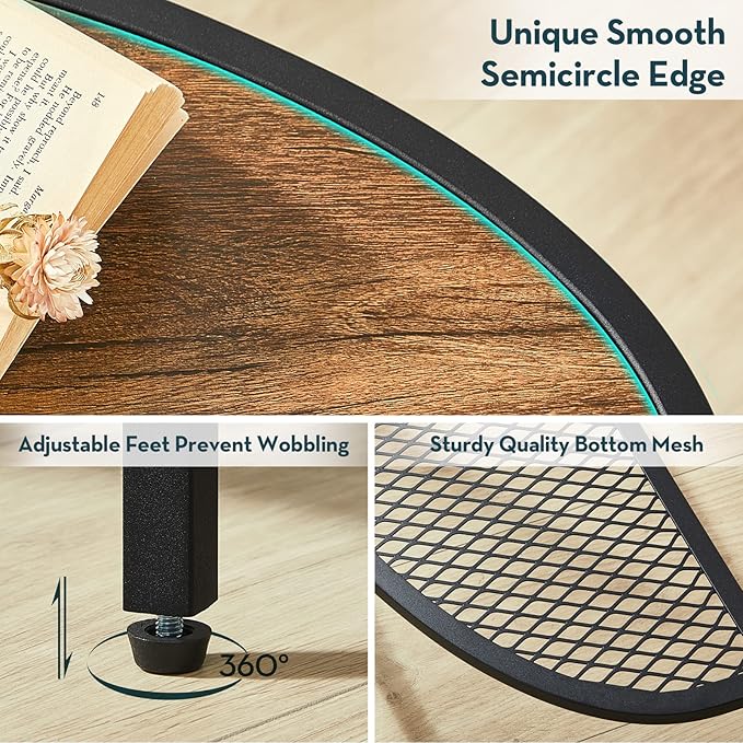 - 【Unique Semicircle Look:】Simple and Elegant semicircle look matches with your modern home style, suitable for small and large spaces. Smooth round edge is much safer than sharp square corners. 2 tier design with industrial vintage style wood top panel and mesh shelves provides spacious storage space, making your space cleaner and tidier.