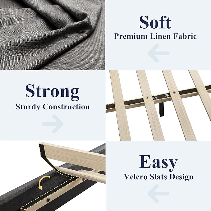 - All-Match Style & Comfort: The bed frame is made from high-quality linen fabric, giving it a sleek appearance. With a straightforward yet sophisticated design that complements various bedroom styles.