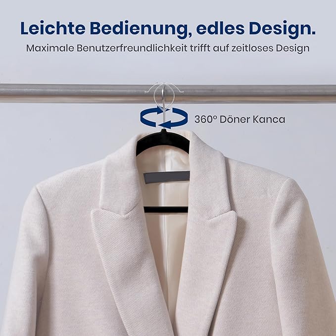 - 360° SWIVEL HOOKS – Rotating chrome-plated hooks allow flexible hanging in any direction, making it easy to access, organize, and arrange clothes without removing them from the rack.