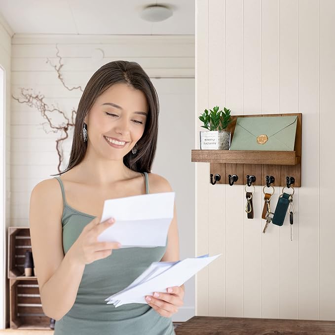 - 【RETRO WALL HOOKS】 With an antiqued finish that enhances the authenticity of our mail and key holder for the wall. Five decorative hooks on a weathered brown key hanger wall mount keep your home tidy. The retro rustic design will add a touch of color to your home.