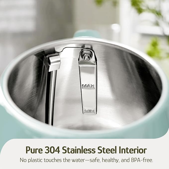 • 【All Stainless Steel】- This retro electric kettle is crafted with food-grade 304 stainless steel in its interior, lid, and filter. It has no plastic in contact with the water, providing you and your family with BPA-free healthy drinking.