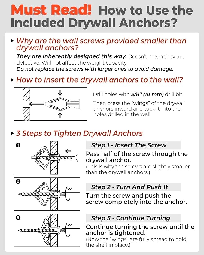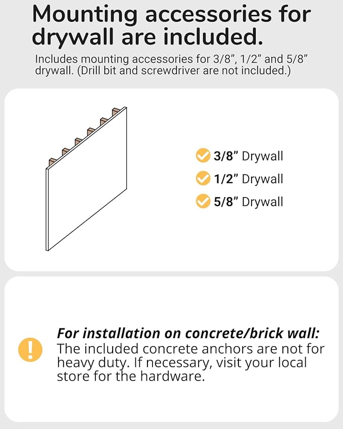 - 【Drywall Anchors Included, Easy to Install】No pre-drilled holes. Drywall mounting accessories Included. (*Wall screws are slightly smaller than drywall anchors for easy installation and do not affect weight capacity.)