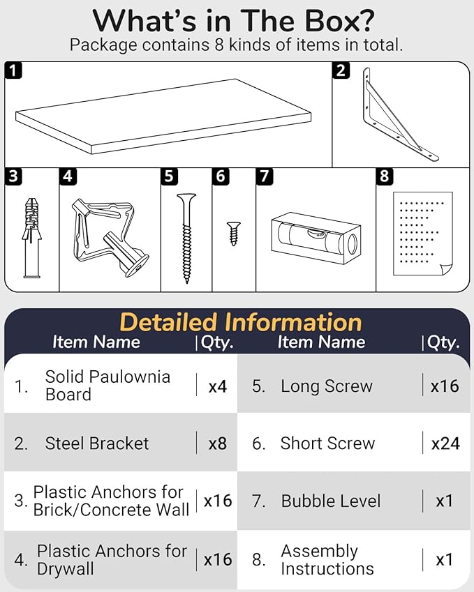 - 【Weight Capacity】When correctly installed, these shelves can hold up to 20-30 lb (9-13.6 kg) on drywall.