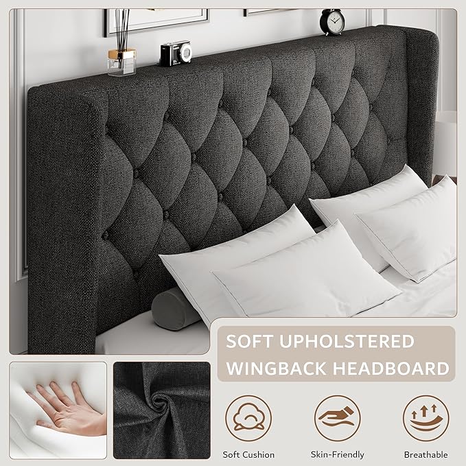 - Upholstered Bed Frame: This wingback bed frame features a soft and comfortable button tufted headboard that you can easily lean against. The winged sides not only secure your pillows but also provide a convenient shelf on top, perfect for placing glasses and phones, making it both practical and functional