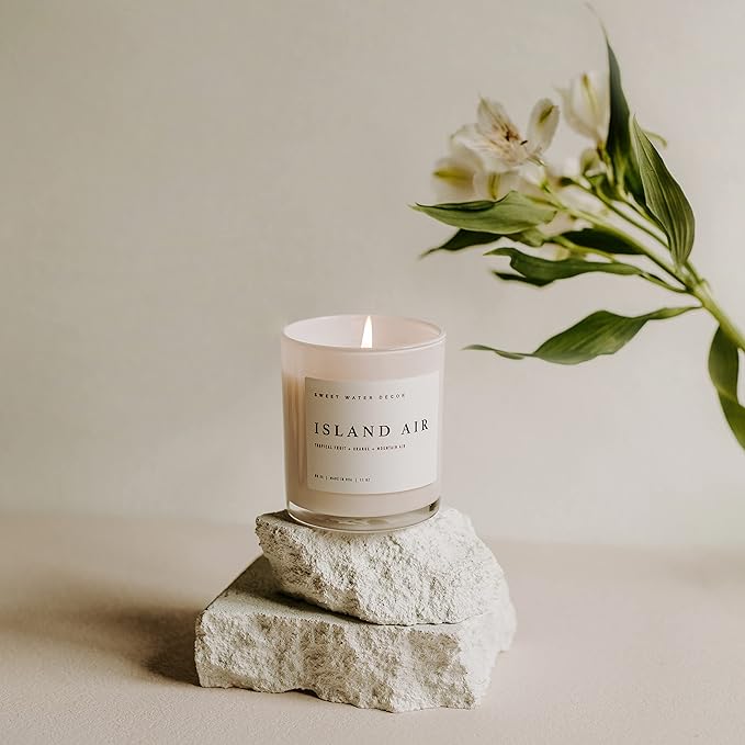 Sweet Water Decor Island Air Soy Candle - Tropical Fruit, Mountain Air, and Orange Scented Summer Candles for Home - 11oz White Glass Jar + Wood Lid, 50+ Hour Burn Time, Made in The USA