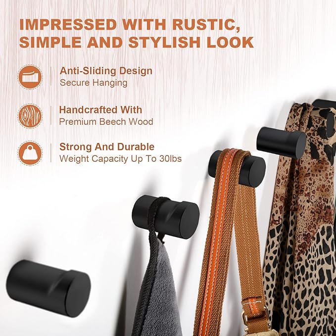 - SIMPLE BUT CAPABLE: Thick solid wood construction with built-in mounting metal hardware, these heavy duty wall hooks are capable to easily hold up to 30 lbs of weight each, and anti-sliding design ensures things are secure hold to avoid slidding off.