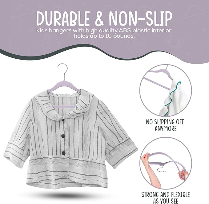 - PREMIUM QUALITY SLIM KIDS HANGERS : Protect delicate baby clothes with slim kids velvet hangers 50 pack - gentle, lint-free, notched shoulders prevent slipping and maintain perfect finish.