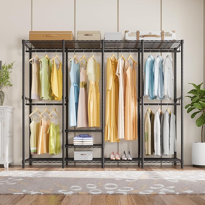 - All-in-one Multifunction Closet Rack: 4 Tiers Extra Large Garment Rack V40 offers you various storage area to place your clothes, accessories, shoes, etc. It features 6 height adjustable shelves for extra storage capacity, 4 detachable hanging bars that easily accommodates to the length and size of your garments.