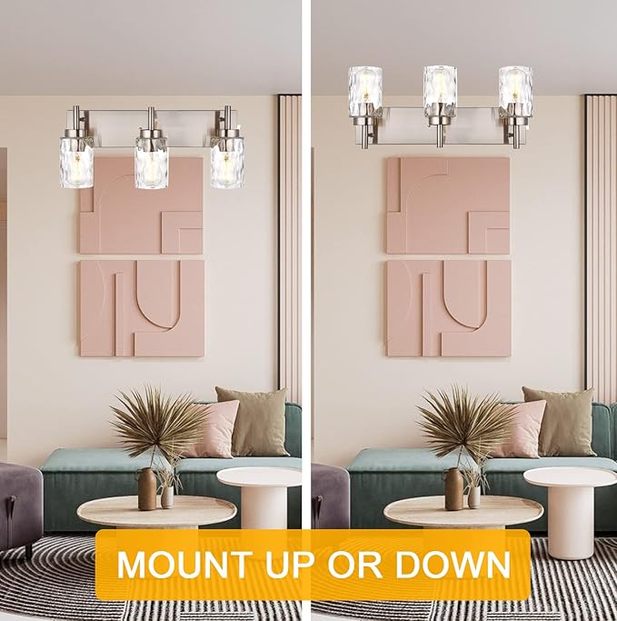 - š Modern & Unique Design:This 3-light wall bathroom vanity light fixture has clear hammered glass shades and a rich finish that creates a farmhouse look in your space.The glass shades bring a refined vintage feel to any room and simple yet elegant metal finish with clear hammered glass shades lends itself to placement in a bathroom, entryway, or dining room, bringing a modern farmhouse vibe to space.It can be mounted in the up or down position.