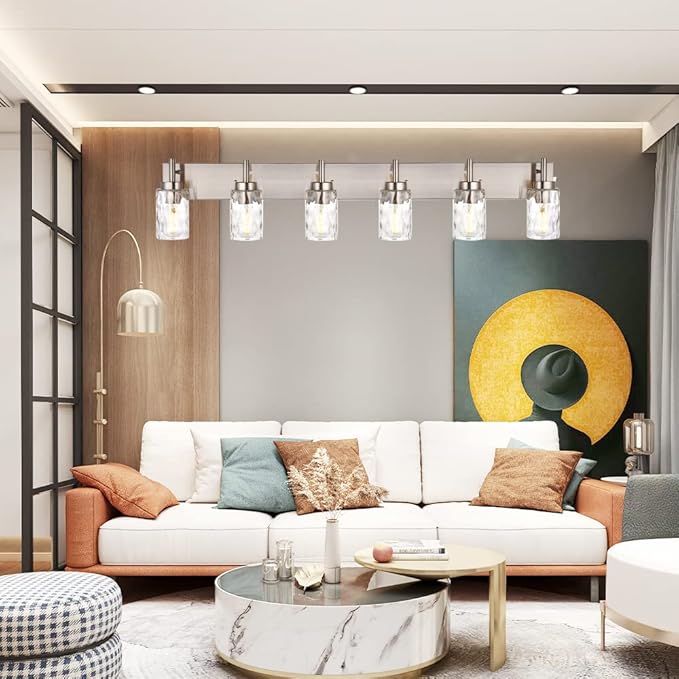- š Modern & Unique Design:This 6-light wall vanity light fixture brushed nickel has clear hammered glass shades and a rich finish that creates a farmhouse look in your space.The glass shades bring a refined vintage feel to any room and simple yet elegant metal finish with clear hammered glass shades lends itself to placement in a bathroom, entryway, or dining room, bringing a modern farmhouse vibe to space.It can be mounted in the up or down position.