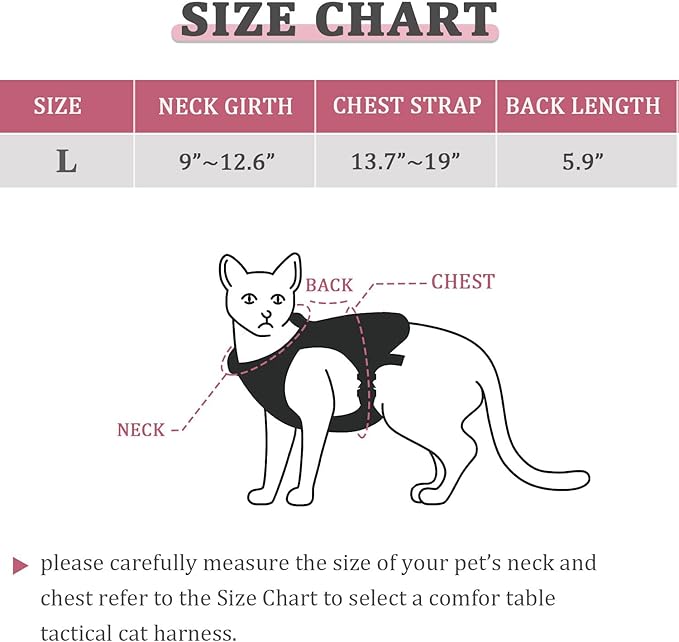 - Harness for Large Cat: Size measuring [NECK GIRTH: 9”-12.6”, CHEST GIRTH 13.7”-19”]. Designed for large,adult,fat cats. Not for small kittens. ATTENTION: Please carefully size chart before order. Package includes: tactical cat harness and leash, 2 embroidered patches