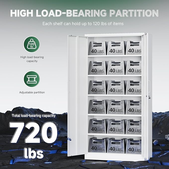 - Upgraded design: Each door is equipped with magnetic suction, all doors can be locked;Adjustable feet for use on uneven floors;One more partition, 30% more storage space than the old model