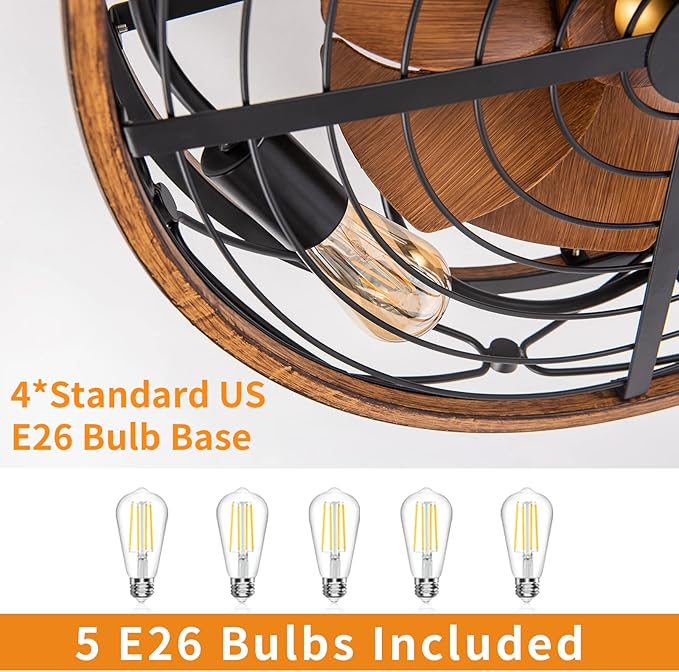 - 【Farmhouse Ceiling Fan with Lights】20 in wood grain black finished metal cage ceiling fan light with 7 blades and 4 E26 light bases (5 bulbs included), perfectly decorate industrial, vintage, rustic and modern style homes, such as bedroom, living room, dining room, hallway, etc.