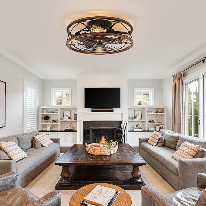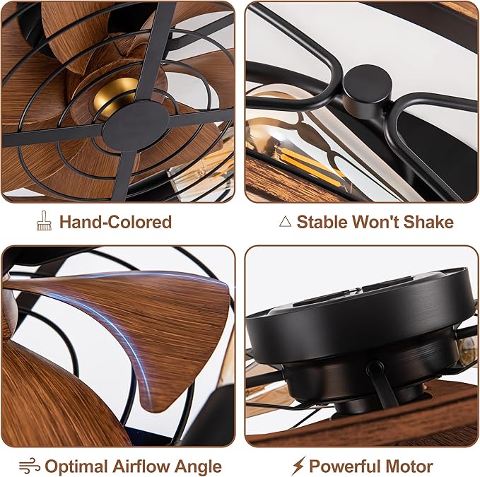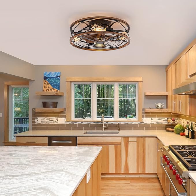 TIFEROR 20" Low Profile Caged Ceiling Fans with Lights and Remote, Farmhouse Flush Mount Ceiling Fan with 3 Speeds Reversible Motor, for Kitchen, Bedroom (Bulbs Included)