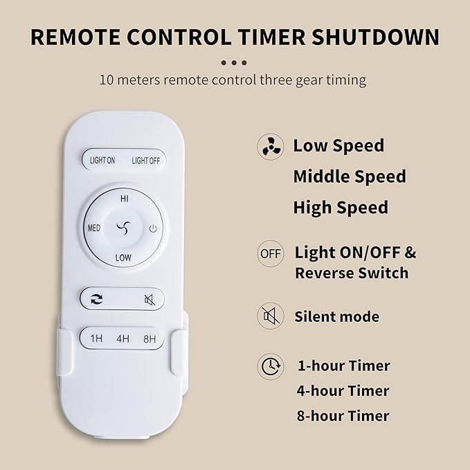 - 【Modern Ceiling fan with remote】 Most operations can be completed through the remote control. 3 speeds for you to adjust : low wind speed--medium wind speed-high wind. And 1/2/4 hours timing off.