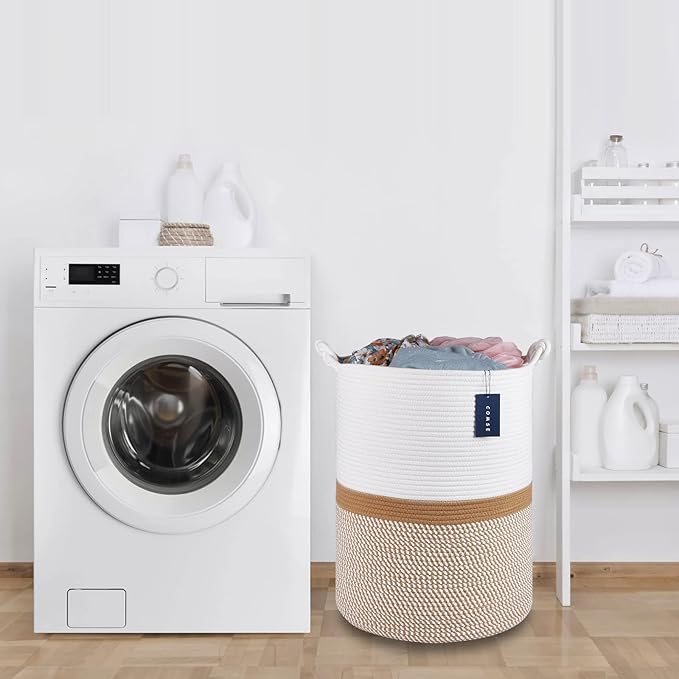 COMSE Extra Large Blanket Basket, Tall Woven Storage Basket, Nursery Hamper, 15.7”x 21.7”, Cotton Rope Laundry Hamper for Toys Clothes Towels, Blend White/Camel