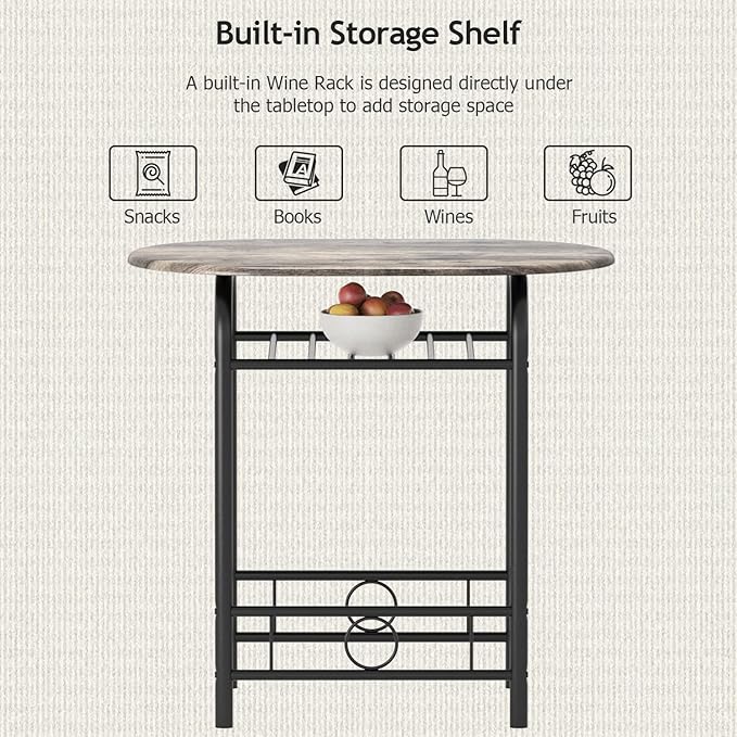 JUMMICO 3-Piece Wooden Round Table & Chair Set, Space Saving Kitchen Breakfast Nook Wood Grain Tabletop with Metal Frame and Built-in Wine Rack for Kitchen, Dining Room (Walnut/Black)