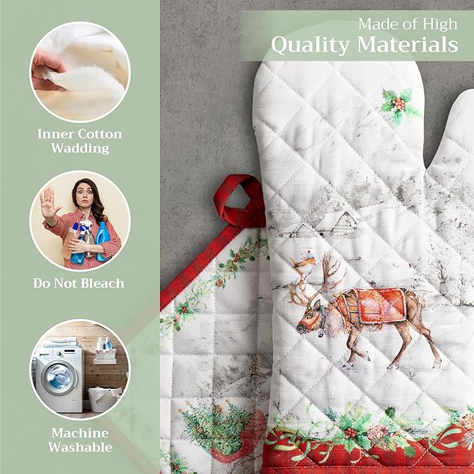 Maison d' Hermine 100% Cotton Oven Mitt & Pot Holder Set (7.5"x13" & 8"x8") Heat Resistant BBQ Cooking Gloves with Loop for Thanksgiving Christmas Decorations Handling Hot Pans (Christmas Tradition)
