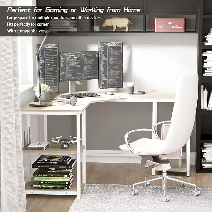 - Enrich Use Space: This large L shaped computer desk features two 2-tier open shelves for storage, providing plenty of surface space for your monitors, laptops or maybe other office supplies and organization. If you need the space for a large computer chassis, feel free to remove the middle shelf for some extra room.