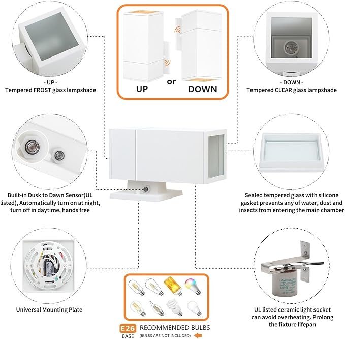 - DUSK TO DAWN ENABLED - The built-in sensor (UL listed) allows this outdoor wall light to operate independently without any light switch – Automatically turn on at night and turn off in daytime, Illuminating a bright night for you. Bulb【 NOT 】included in this porch light fixture.