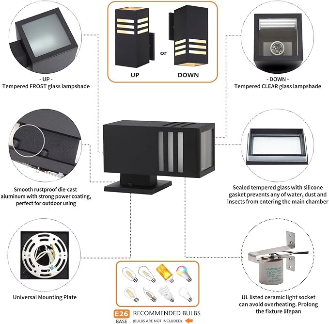 - DEFINITELY SHINES UP or DOWN - Bulb【 NOT 】included in this porch light fixture, Up down lids comes with Toughened glass diffuser.