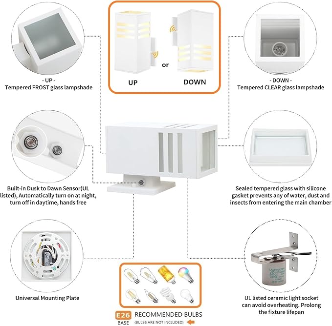 - DUSK TO DAWN ENABLED - The built-in sensor (UL listed) allows this outdoor porch light to operate independently without any light switch – Automatically turn on at night and turn off in daytime, Illuminating a bright night for you. Bulb【 NOT 】included in this porch light fixture.