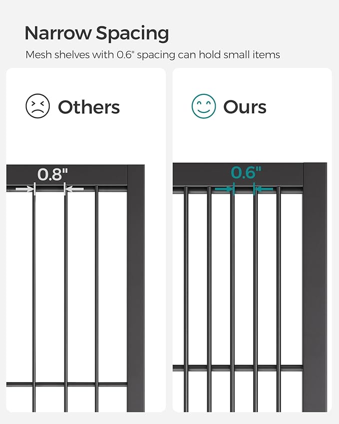 - [Reliable Support for Your Items] Dense mesh shelves with 0.6" (1.5 cm) spacing fit even small items. The strong steel frame boasts high strength for firm support (with casters, max. 44 lb (20 kg) per shelf; with adjustable feet, max. 110 lb (50 kg) per shelf)