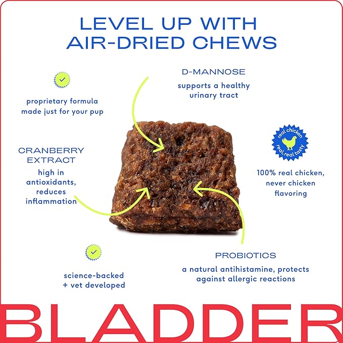 - BLADDER SUPPORT DISGUISED AS A TASTY TREAT: These cranberry dog treats double as a powerful dog UTI supplement, delivering effective urinary support in a form your pup will love. Real chicken flavor makes it easy to support their bladder health daily. Please Note: Packaging may vary due to design changes. Contents remain unchanged in quality and ingredients.