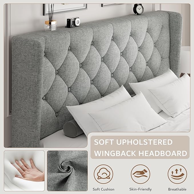 - Upholstered Bed Frame: This wingback bed frame features a soft and comfortable button tufted headboard that you can easily lean against. The winged sides not only secure your pillows but also provide a convenient shelf on top, perfect for placing glasses and phones, making it both practical and functional