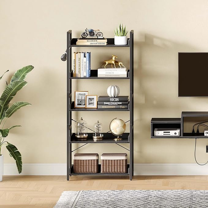 Rolanstar Bookshelf 5 Tier with 4 Hooks, Industrial Wood Bookcase, Vintage Storage Rack with Open Shelves, Rustic Standing Bookshelves Wood Frame Display Rack for Living Room, Bedroom, Black