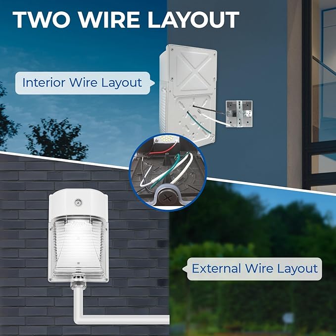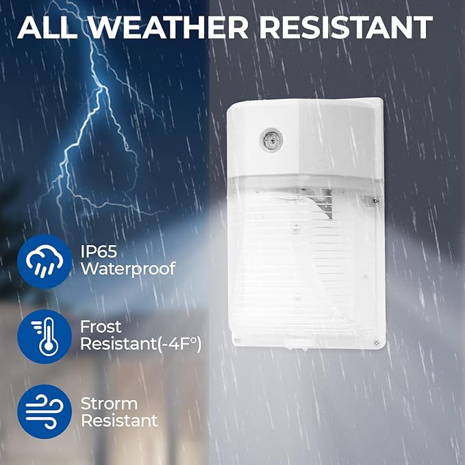 - Automated dusk-to-dawn photocell functionality. Light OFF at sunrise/daytime and light ON at sundown/night. Die-casting of aluminum housing with clear lens, Anti-corrosion, Waterproof IP65, 5000K Daylight Lighting for Outdoor illumination.