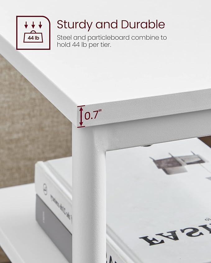 - [Strong yet Stable] 2 steel side frames lift and brace 2 particleboard panels, making a solid structure that stays put after loaded with 44 lb of items on each tier. Small unevenness in the floor? The feet are adjustable to even it out