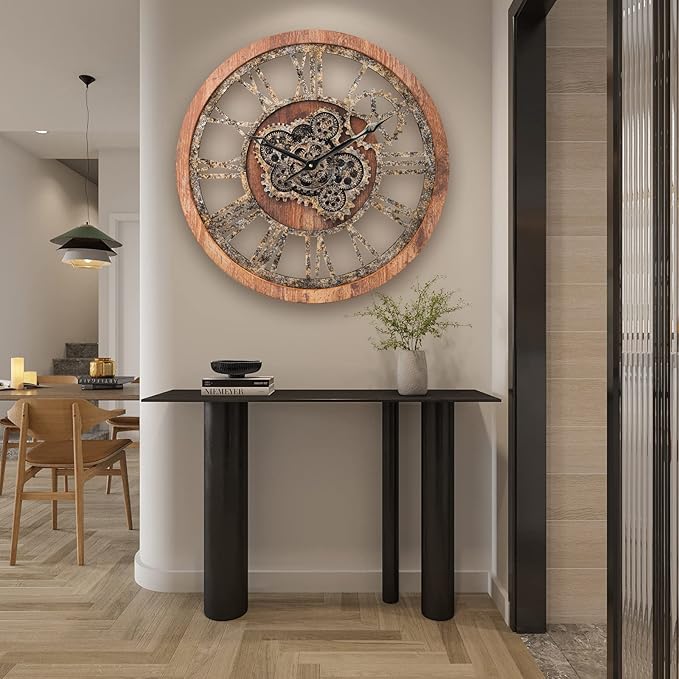 HOIBAI Large Wall Clock 24 Inch Large Clocks for Living Room Decor with Moving Gears Vintage Industrial Steampunk Farmhouse Big Clock for Home Kitchen Bedroom Office