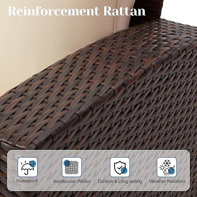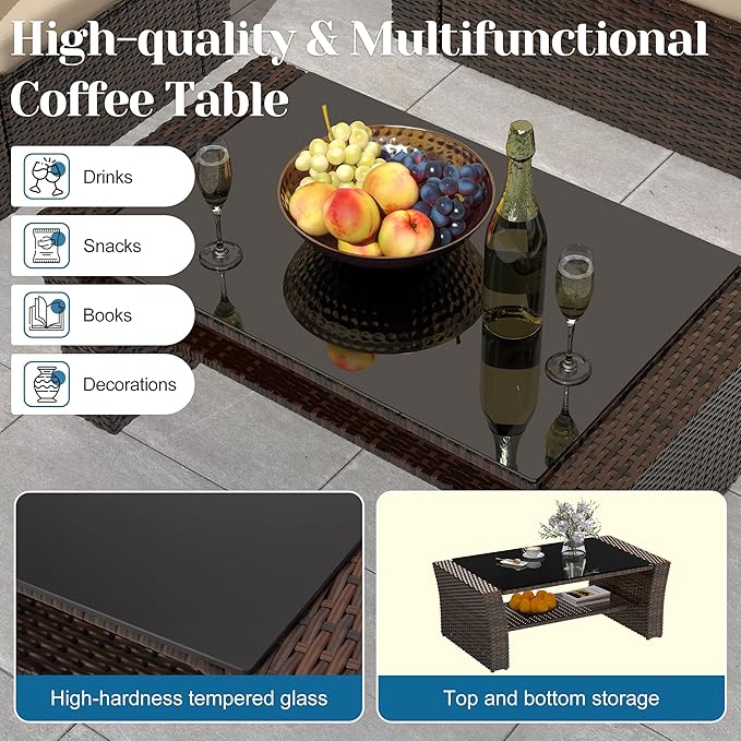 • 【EASY ASSEMBLY & CLEAN】With the detailed instruction, you can assemble the 4 piece outdoor wicker patio furniture sets quickly. And it’s easy to clean because the porch conversation sets feature tempered glass of table, water resistant cushions and removable cushion covers.
